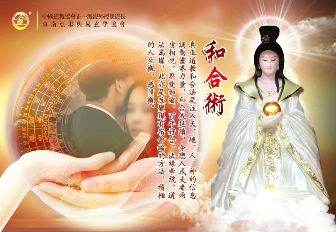 請道長設壇作法,在法壇上施展教內法術,調動親養五方神兵及神邸,將男女雙方的三魂七魄攝拿於壇前,再動用合和大法,遣神調將,對雙方進行強制性搓合,催緣,並續姻緣。此和合符法注入天、地、人、神信息,調動靈界力量。如催動天喜紅鸞星神、和合二仙、月下老人、月合老人,九天玄女等神從而增進宿命論中的姻緣。或和合或延續,或增緣或借緣,或化解阻星、小人、競爭者、第三者,令戀人或夫妻兩情相悅,恩愛如蜜,百年好合。法緣牽線,道法為媒,此亦是改變現有宿命論的方法,是積極的人生觀,感情觀。