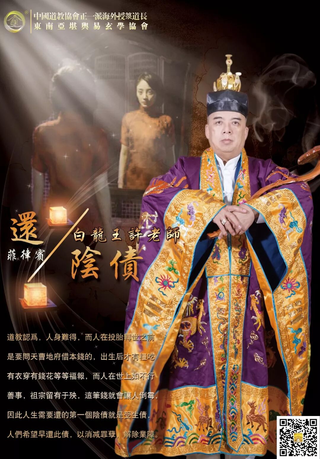 白龍王許大師,中國道教協會正一派海外道長,東南亞易玄學協會創會長,四十多年風水實踐經驗,擅長短時間內重造風水, 升旺氣場,八字合婚、擇吉日、陰陽宅風水、淨宅化煞、八字起名、寶寶起名、改名升文、童子命、太歲化解、逢九刑沖、還陰債、補財庫、觀音借庫、種生基消災延壽、化解前世、處理卡陰、超拔嬰靈、和合術、催財催官催桃花催姻緣、文昌扶持升學事業仕途順利等;